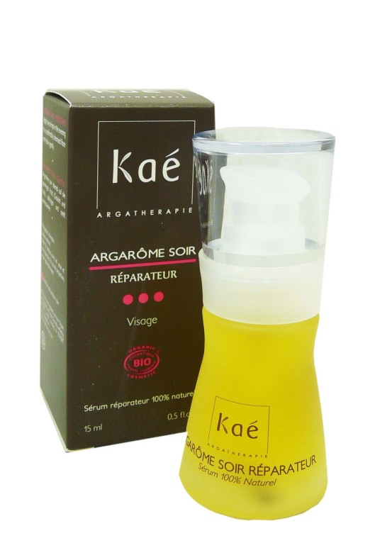 KAE développe des soins cosmétiques 100% naturel dédiés à la beauté de la peau et des cheveux, inspirés du savoir-faire traditionnel oriental grâce à une composition exceptionnelle à base d’huile d’argan et d’huiles essentielles. L’huile d’argan très concentrée en vitamine E, renforce le film hydrolipidique cutané, ralentit le vieillissement cellulaire et stimule les défenses anti radicaux-libres. Sérum ARGARÔME soir réparateur de KAE, à l’huile d’argan et à l’huile essentielle de lavande, est idéal le soir en complément du soin de nuit ARGABAUME : ce sérum équilibre, purifie, assainit et draine les peaux réactives ou sujettes aux imperfections pendant la phase de régénération nocturne. En quelque semaine, la qualité de la peau est visiblement améliorée.