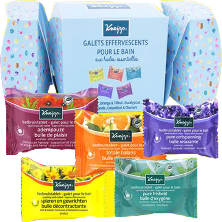 Depuis 1891, KNEIPP développe des produits destinés au bien-être et au maintien de la santé à travers une large gamme de soins corporels et produits pour le bain, composés exclusivement d’extraits de plantes et d’ingrédients d’origine naturelle. La philosophie de KNEIPP s’articule autour de l’art du bain et les galets de bain participe à cette philosophie. Ces galets effervescents libèrent progressivement dans l’eau chaude leurs huiles essentielles et leurs sels thermaux et offrent, grâce à leurs délicates bulles sur la peau, un massage extrêmement délassant. La formule de ces galets est exempte de conservateur et d’huile minérale, testée sous contrôle dermatologique et non testée sur les animaux. Chaque parfum procure un bienfait particulier : le galet Bulle Relaxante à la lavande est relaxant et apaisant ; le galet Bulle d’Harmonie à l’oranger fleurs de tilleul est calmant et favorise le sommeil ; le galet Bulle Décontractante à l’arnica est calmant sur les raideurs musculaires et douleurs articulaires ; le galet Bulle de Plaisir au coquelicot est revitalisant pour le corps, et apaisant pour l’esprit ; le galet Bulle d’Oxygène à l’eucalyptus est stimulant et décongestionnant sur la fatigue et les voies respiratoires.