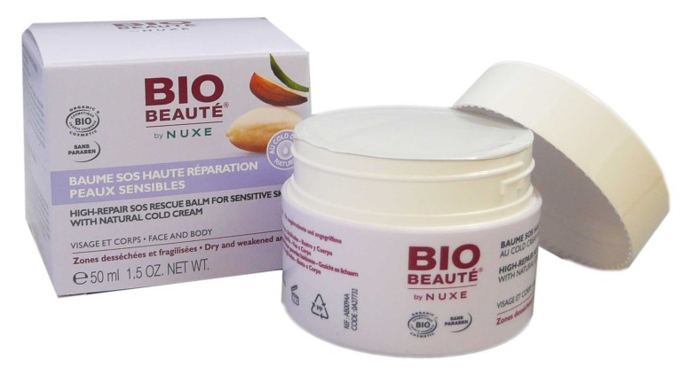 La gamme Soins Haute Nutrition Bio Beauté de NUXE sont composés de soins doux pour redonner du confort aux peaux sensibles sèches et très sèches. Le baume SOS Haute Réparation nourrit intensément, protège de la sècheresse et des irritations, répare et apaise la peau grâce au cold Cream naturel composé d’extraits floraux bio (huile d'amande douce bio, eau de rose) et de cire d’abeille bio ainsi qu’au complexe « SOS » Végétal (huile de pépins de cassis). Sa texture « oléo-cire » au délicat parfum d’amande se transforme en huile de soin pendant le massage pour procurer un bien être incomparable et un instant de douceur intense.