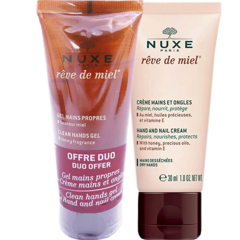 Le Lot Rêve de Miel discount de NUXE, le pouvoir prodigieux de la nature dans votre parapharmacie en ligne à prix discount, dans 2 soins conçus pour nettoyer réparer, nourrir et protéger les mains sèches et abimées et les parfumer avec gourmandise ! Gel Mains Propres (30ml) ; Crème Mains & Ongles (30ml).