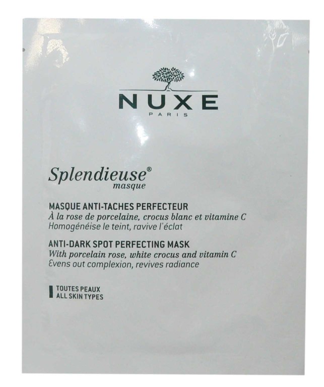 Nuxe, contraction de Nature et Luxe, développe depuis 25 ans des soins cosmétiques raffinés, élaborés avec des actifs végétaux précieux, sans huile minérale ni matière animale hormis les produits de la ruche, pour offrir des produits associant avec le plus bel équilibre : nature, performance et sensualité. Le Masque antitaches sous forme de sachet composé de rose de porcelaine, crocus, blanc, et vitamine C, estompe les taches cutanées et lutte contre leur réapparition, redonne de l’éclat et de la fraîcheur au teint. En seulement 10 minutes, la peau retrouve tout son éclat. Jour après jour, le teint est unifié les taches cutanées s’estompent.