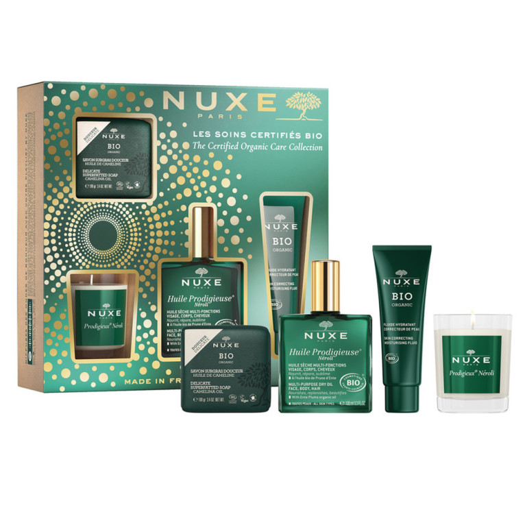 Le Coffret « Les Soins Certifiés Bio » discount de NUXE, 3 produits certifiés biologiques et 1 bougie à offrir ou à se faire offrir, pour des fragrances apaisantes aux notes de néroli ! Huile Prodigieuse Néroli (100ml) ; Nuxe BIO Fluide hydratant Correcteur de peau (50ml) ; Nuxe BIO Savon surgras Douceur (100g), Bougie d’intérieur Prodigieux Néroli (70g), dans votre parapharmacie en ligne à prix discount.