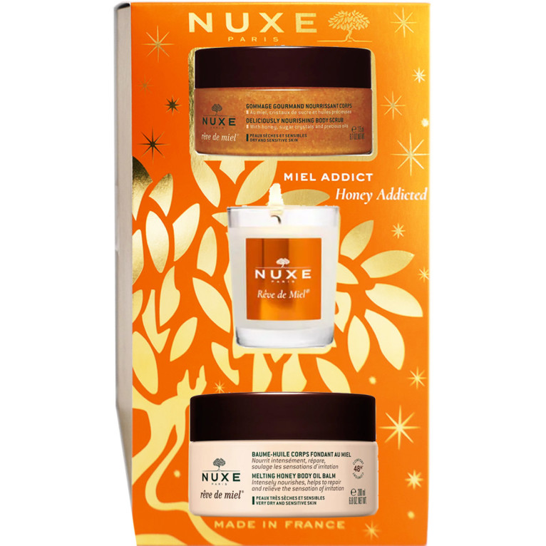 Le Coffret « Miel Addict » de NUXE, un coffret à offrir ou à se faire offrir, pour des fragrances mythiques réconfortantes et gourmandes des soins Rêve de Miel composé de Rêve de miel Gommage Nourrissant Corps (175ml) et Rêve de Miel Baume-huile Corps Fondant au Miel (200ml) + Rêve de Miel Bougie d’intérieur (70g). Dans votre parapharmacie en ligne à prix discount. Tous types de peaux Corps