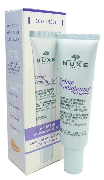 Nuxe, contraction de Nature et Luxe, développe depuis 25 ans des soins cosmétiques raffinés, élaborés avec des actifs végétaux précieux, sans huile minérale ni matière animale hormis les produits de la ruche, pour offrir des produits associant avec le plus bel équilibre : nature, performance et sensualité. La gamme Crème Prodigieuse propose des soins hydratants et défatiguants, conçus pour protéger la peau du stress oxydatif et l’envelopper des fragrances solaires et envoutantes de l’huile mythique de NUXE : l’huile Prodigieuse. La crème Prodigieuse DD crème de NUXE, à la texture légère et fondante, formulée avec 58% d’ingrédients d’origine naturelle dont des extraits de fleurs d’immortelle bleue, de feuilles de thé blanc ,du beurre de karité et une protection SPF 30 anti UVA-UVB, s’utilise tout au long de l’année pour protéger la peau des agressions extérieures, tout en sublimant naturellement le teint. Effet « peau nue », s’adapte à toutes les carnations, sans paraben, non comédogène.