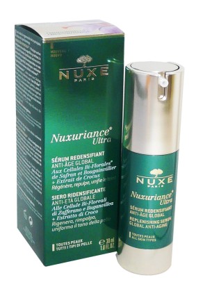 Nuxe, contraction de Nature et Luxe, développe depuis 25 ans des soins cosmétiques raffinés, élaborés avec des actifs végétaux précieux, sans huile minérale ni matière animale hormis les produits de la ruche, pour offrir des produits associant avec le plus bel équilibre : nature, performance et sensualité. La gamme Nuxuriance propose des soins anti-âge conçus pour redensifier, repulper et raviver l’éclat des peaux matures. Sérum redensifiant Nuxuriance Ultra de NUXE est un soin très concentré à base de cellules Bi-Florales de Safran et de Bougainvillier, ainsi que de crocus. Jour après jour, elle va réparer les cellules de l’épiderme qui diminuent avec l’âge pour mieux lutter contre l’apparition des rides et ridules en les stimulant, repulper la peau, lisser la peau pour estomper les rides, et redessiner l’ovale du visage. Dès l’application la peau sera douce, intensément hydratée et délicatement parfumée aux senteurs de fleur d’oranger, framboise et santal. Jour après jour, la peau est repulpée, raffermit, défroissée, rides et ridules lissées pour retrouver un visage rajeunit et un teint unifié et lumineux. L’ovale du visage est redessiné.