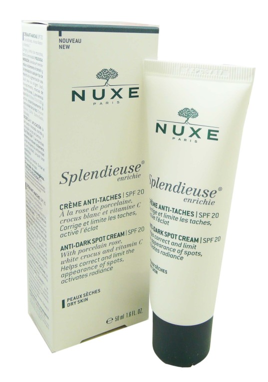 La gamme Splendieuse de NUXE est composée de soins à base de 5 brevetspour effacer les taches cutanées jour après jour pour un teint unifié et éclatant. Le soin composé de rose de porcelaine, crocus, blanc, Lys étoilé, vitamine C et filtres UVA/UVB (SPF 20), estompe les taches cutanées et lutte contre leur réapparition, protège, nourrit et hydrate intensément la peau. Dès l’application, la peau retrouve tout son éclat. Jour après jour, les taches cutanées s’estompent.