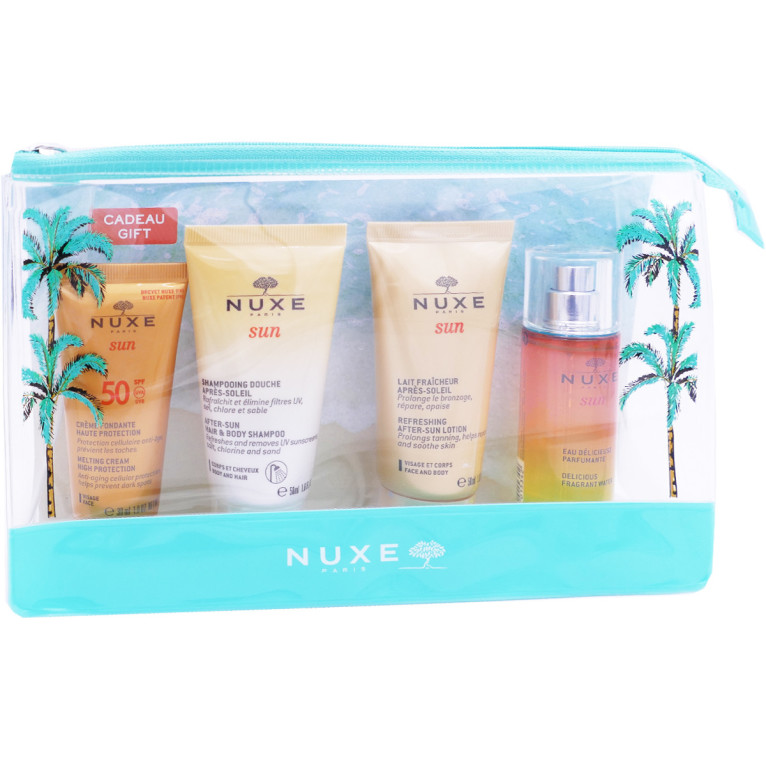 Nuxe crème fondante 30ml : Appliquer la crème délicieuse avant l’exposition au soleil uniformément sur le visage. Renouveler régulièrement l’application surtout après la baignade ou après avoir transpiré.Ne pas s’exposer au soleil entre 12h et 16h Shampooing douche après soleil 50ml : S’utilise sous la douche ou dans le bain. Appliquer sur la peau mouillée et les cheveux humides, faire mousser et rincer abondamment Lait fraîcheur après soleil 50ml : Appliquer le lait fraîcheur sur le visage et le corps propres et secs après l’exposition au soleil. Eau délicieuse parfumante 30ml : Vaporiser un nuage d’Eau Délicieuse puis le traverser pour s'imprégner du parfum chaud et frais. L’Eau Délicieuse peut être aussi utilisée pour se brosser les cheveux. Faire quelques vaporisations sur la brosse à cheveu puis se coiffer. Pour un lit et un sommeil transporté dans des endroits ensoleillés, faire quelques vaporisations sur les draps.