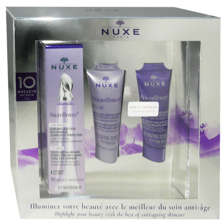 Le coffret Nuxellence de NUXE à prix discount, le pouvoir prodigieux de la nature dans votre parapharmacie en ligne, dans un coffret réunissant 3 soin anti-âge conçu pour recharger la peau en jeunesse et en luminosité, tout type de peau, tout âge : Nuxellence Soin anti-âge yeux (15ml) ; Nuxellence Soin éclat (15ml) offert ; Nuxellence Détox (15ml) offert.