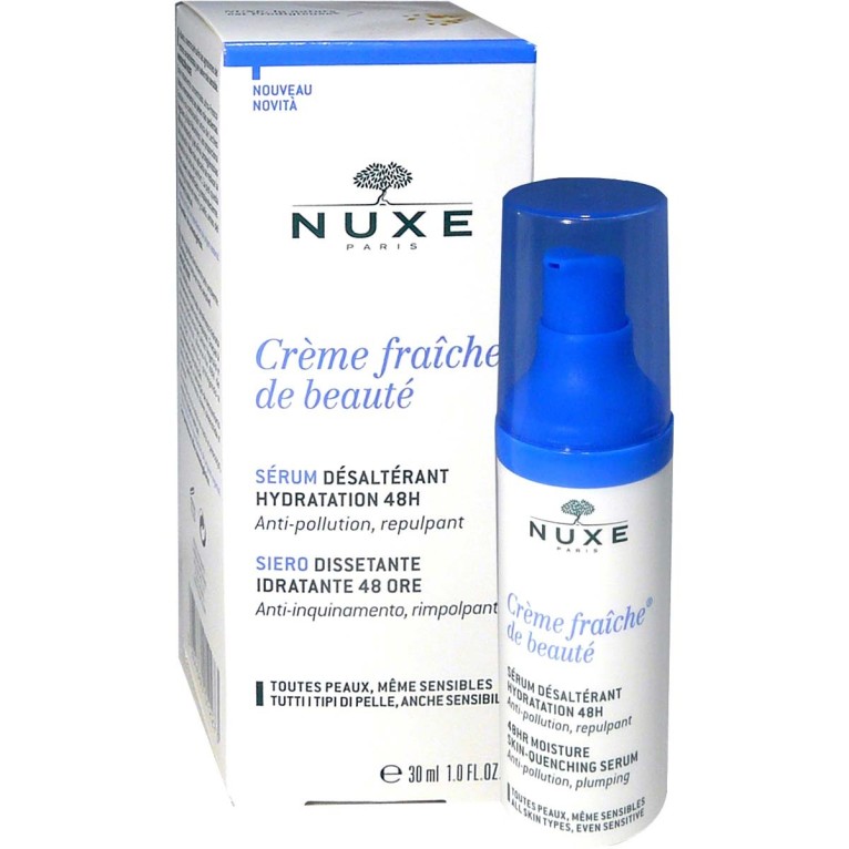 Nuxe, contraction de Nature et Luxe, développe depuis 25 ans des soins cosmétiques raffinés, élaborés avec des actifs végétaux précieux, sans huile minérale ni matière animale hormis les produits de la ruche, pour offrir des produits associant avec le plus bel équilibre : nature, performance et sensualité. La gamme Crème fraîche de Beauté propose des soins au lait végétal pour assurer une hydratation intense pendant 24 heures aux peaux assoiffées. Le Sérum désaltérant hydratant Crème fraîche de beauté, formulé avec 96,4% d’ingrédients d’origine naturelle dont des laits végétaux et un extrait d’Algue High-tech, est spécialement conçu pour protéger la peau des agressions quotidiennes et de la pollution hydrater intensément et maintenir un taux d’hydratation optimal pendant 48 heures. Elle contient également de l’acide hyaluronique d’origine naturelle pour renforcer le pouvoir d’hydratation. Sa texture gel-crème gorgée d’eau qui fond sur la peau, la laisse fraîche dès l’application. La peau est rebondie, et retrouve souplesse et confort instantanément, elle s’enveloppe d’un délicat parfum de fleurs d’oranger, de cèdre et d’amandier. Sans paraben, hypoallergénique.