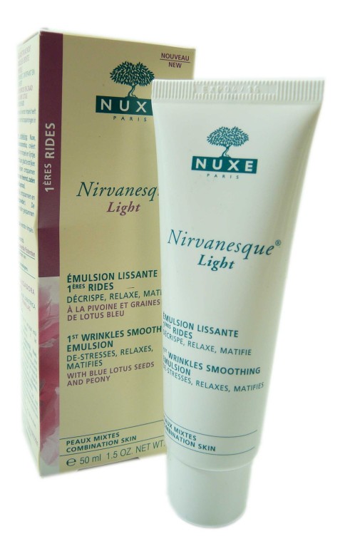 Nuxe, contraction de Nature et Luxe, développe depuis 25 ans des soins cosmétiques raffinés, élaborés avec des actifs végétaux précieux, sans huile minérale ni matière animale hormis les produits de la ruche, pour offrir des produits associant avec le plus bel équilibre : nature, performance et sensualité. La gamme Nirvanesque propose des soins anti-âge composés d’extraits de pivoine et des graines de lotus bleu pour lisser les premières rides, défatiguer les traits et relaxer la peau. L’émulsion Nirvanesque light de Nuxe, formulée avec 87% d’ingrédients d’origine naturelle dont des extraits de racine de guimauve, des graines de coquelicot et de la poudre de riz, est spécialement conçue pour lisser visiblement les rides d’expression, relaxer intensément la peau et assurer un fini mat sans brillance toute la journée. Les traits du visage sont défatigués, la peau est relaxée, elle s’enveloppe d’un délicat parfum de mimosa, le visage est détendu. Sans paraben, non comédogène.