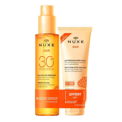 NUXE SUN HUILE SOLAIRE BRONZANTE SPF30 150ML + LAIT FRAICHEUR APRES SOLEIL 100ML : Découvrez une protection solaire optimale en vente en ligne, sur le site de votre parapharmacie à prix discount