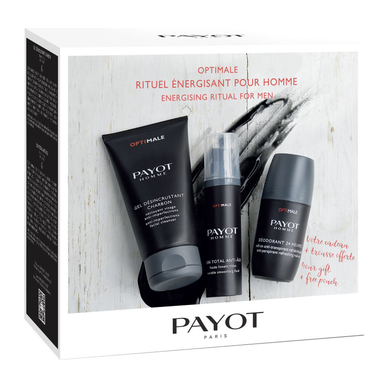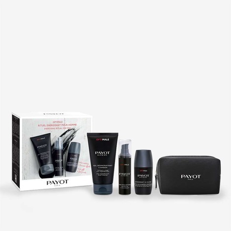 Le coffret « Rituel Energisant Optimale Homme » de PAYOT discount, 3 soins frais et énergisants dans votre parapharmacie en ligne à prix discount, pour un programme de soins quotidien douceur et tonifiants : Soin Total Anti-âge (50ml) ; Déodorant 24H (75ml) et Gel Désincrustant Charbon (150ml). Trousse offerte