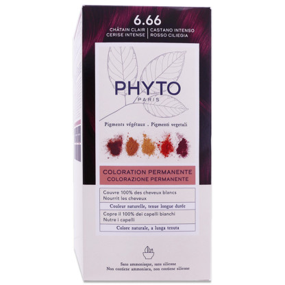 Phyto Color Coloration Permanente des laboratoires Phytosolba, à prix discount dans votre pharmacie en ligne, la coloration sans ammoniaque pour une couleur intense, naturelle et une brillance inégalable. Couleur 6.66 Châtain Clair Cerise Intense.