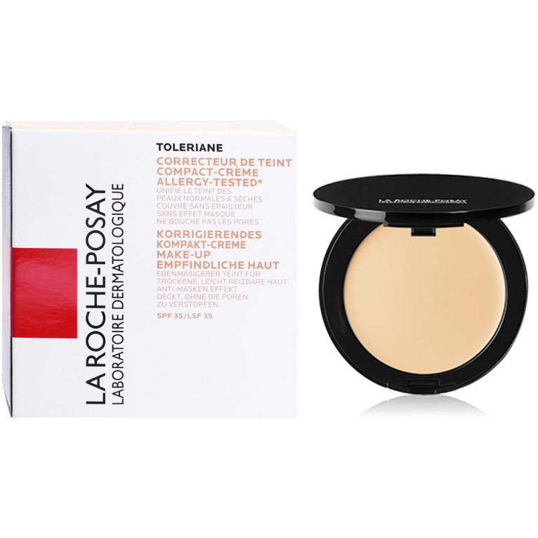 Depuis plus de 30 ans, le laboratoire LA ROCHE POSAY développe des produits dermo-cosmétiques élaborés avec de l’eau thermale de LA ROCHE POSAY riche en Sélénium aux propriétés anti-radicalaires, pour répondre à tous les besoins des peaux même les plus fragiles. La gamme TOLERIANE TEINT propose des soins à haut pouvoir correctif pour assurer un teint uniforme et naturel, dans le plus grand respect des épidermes sensibles. TOLERIANE TEINT Compact, à la texture crème waterproof ultra-fine et facilement modulable grâce à l’éponge douce, permet de couvrir sans surcharge les imperfections sévères des peaux sensibles à intolérantes, et assure un résultat poudré très naturel sans effet masque. Formule très haute tolérance enrichie d’un filtre protecteur SPF 35, 30 % de pigments enrobés, sans conservateur, sans parfum, existe en 4 teintes.