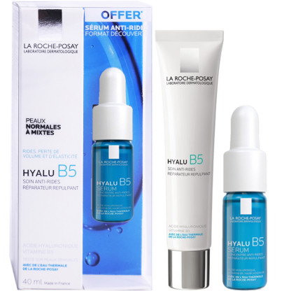 HYALU B5 discount de LA ROCHE-POSAY, 2 soins concentrés haute-performance à l’acide hyaluronique et à la vitamine B5 dans votre parapharmacie en ligne à prix discount, pour corriger les signes du temps, protéger et repulper la peau. Hyalu B5 Soin Anti- rides (40ml) et Hyalu B5 Sérum (10ml) Offert. Tous types de peaux même sensibles.