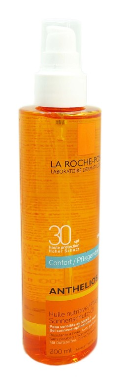 Depuis plus de 30 ans, le laboratoire LA ROCHE POSAY développe des produits dermo-cosmétiques élaborés avec de l’eau thermale de LA ROCHE POSAY riche en Sélénium aux propriétés anti-radicalaires, pour répondre à tous les besoins des peaux même les plus fragiles. La gamme ANTHELIOS recommandée par les dermatologues, propose des produits aux formules haute-tolérance pour assurer la protection solaire des peaux les plus sensibles. ANTHELIOS Huile nutritive SPF 30 à la texture nourrissante qui dépose un film invisible sur la peau non collant, est spécialement conçue pour assurer une haute protection UVA/UVB, protection renforcée contre les UVA longs, grâce au système filtrant exclusif Mexoryl XL®. Ce soin est particulièrement recommandé pour protéger les peaux sensibles sèches des échauffements dus au soleil, mais aussi des réactions cutanées et des dommages cellulaires engendrés par les UV. Formule testée sous contrôle dermatologique, sans paraben. Résistant à l'eau.