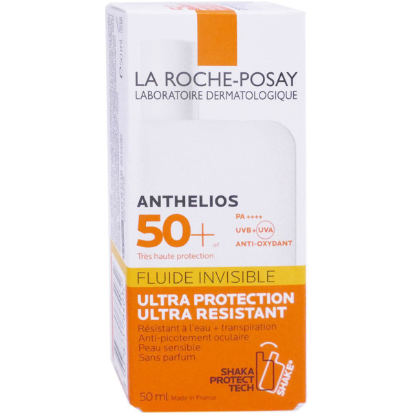La gamme Anthelios de LA ROCHE POSAY est composée de soins solaires et hydratants pour les peaux sensibles ou allergiques au soleil de toute la famille formulés avec des formules de haute tolérance. Anthelios Fluide Invisible SPF50+ est une très haute protection (SPF 50+) qui protège des rayons UVA/UVB longs et courts à large spectre des infrarouges et de la pollution grâce à son système filtrant anti UVA/UVB, et préserve les cellules de l’épiderme du vieillissement prématuré. L’eau thermale de La Roche-Posay calme les rougeurs et hydrate la peau. Sa texture fluide, facile à appliquer qui ne laisse pas de traces blanches ni d’effet gras ou collant, laisse la peau douce et fraîche. Elle résiste très bien à l’eau et est formulé pour limiter les picotements aux yeux. Son flacon à agiter avant utilisation (shake) contient une bille qui permet d’homogénéiser le fluide. Sans parfum. Testé sous contrôle dermatologique et ophtalmologique