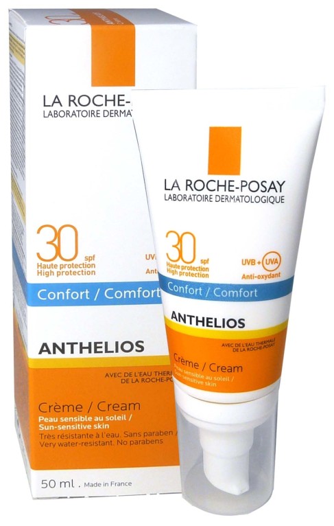 La gamme Anthelios de LA ROCHE POSAY est composée de soins solaires et hydratants pour les peaux sensibles ou allergiques au soleil de toute la famille formulés avec des formules de haute tolérance. Anthelios Crème confort SPF30 est une haute protection (SPF 30) qui protège des rayons UVA/UVB longs et courts à large spectre grâce à son système filtrant et son innovation BAICALIN aux propriétés anti-oxydantes, et préserve les cellules de l’épiderme du vieillissement prématuré. L’eau thermale de La Roche-Posay calme les rougeurs et hydrate la peau. Sa texture fondante, non collante et non grasse facile à appliquer qui ne laisse pas de traces blanches, laisse la peau veloutée et délicatement parfumée. Elle résiste très bien à l’eau. Sans paraben. Non comédogène. Testé sous contrôle dermatologique