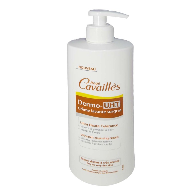 Depuis 1855, Rogé Cavailles développe des produits d’hygiène dans un souci constant d’offrir un haut niveau de qualité pour assurer respect, protection et confort aux épidermes les plus sensibles. La gamme Douche Soins et plaisirs de ROGE CAVAILLES est composée de soins lavants très doux riches en agents surgras aux textures plaisirs et parfumés pour prendre soin des peaux très sèches et sensibles de toute la famille pendant la toilette. Sans savon, sans paraben, sans allergène, et au pH physiologique, la peau est nettoyée en douceur grâce à sa richesse en agents surgras haute tolérance. Avec cette crème lavante surgras Dermo U.H.T. (Ultra Haute Tolérance) la peau est intensément nourrie, adoucit et protégée des agressions extérieures. Le film protecteur est renforcé pour lutter contre le dessèchement grâce au beurre d’illipé riche en acides gras naturels et au complexde Dermo-U.H.T. Sa texture crème développe une mousse onctueuse qui enveloppe le corps de douceur tout au long de la journée ! Après la toilette, la peau retrouve tout son confort et sa souplesse, elle est extrêmement douce.