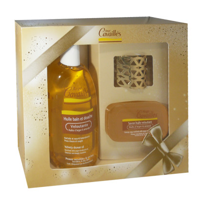 Le Coffret ROGE CAVAILLES, 2 soins douceur pour nettoyer et prendre soin de sa peau sèche accompagné d’un joli bracelet : Huile de bain et douche Veloutante (250ml) et un Savon huile Veloutant (115g) Un coffret à offrir ou à se faire offrir !