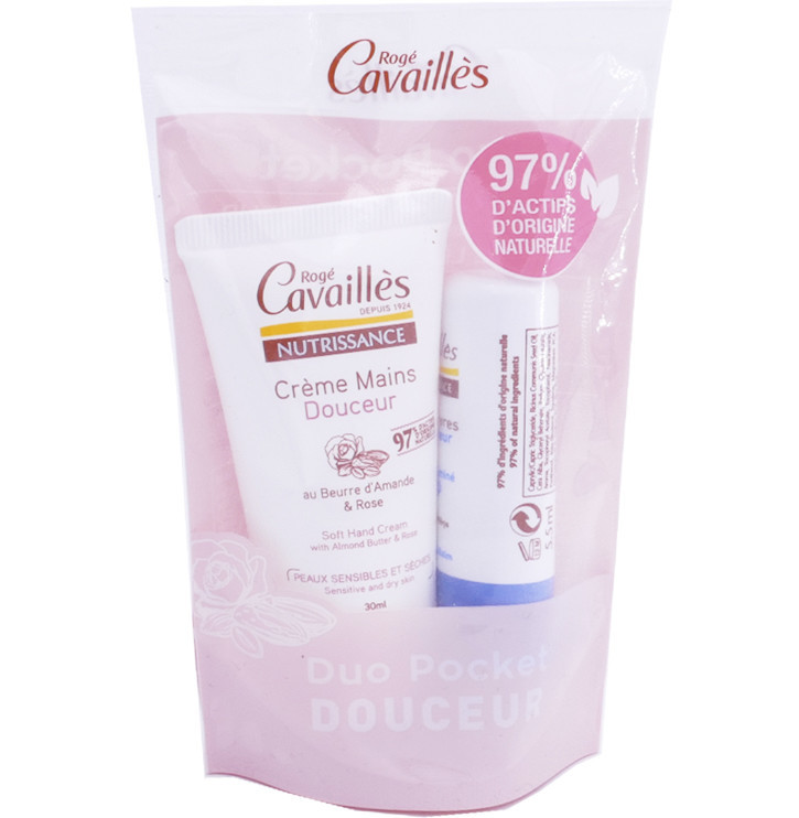 Duo Pocket Crème mains Douceur et stick lèvres réparateur discount de ROGE CAVAILLES, des soins petits pour réparer et apaiser les mains & lèvres et mains abîmées, sensibles ou sèches dans votre parapharmacie en ligne à prix discount.