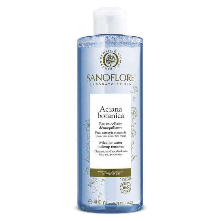 SANOFLORE extrait toutes les richesses du végétal et les incorpore dans une gamme de soins de beauté élaborés à base d’eaux florales et d’huiles essentielles, pour offrir le meilleur de la nature aux peaux les plus sensibles. La gamme Aciana Botanica de SANOFLORE est composée de soins démaquillants à base d'ingrédients bio pour nettoyer et réconforter toutes les peaux du visage, des yeux et des lèvres même les plus sensibles, L’eau micellaire Aciana Botanica à base de tensio actifs doux et riche en eaux florales bio (bleuet, mélisse, rose), ainsi que d’un polymère d’origine naturelle (gomme de xanthane), va éliminer tout en douceur le maquillage, les impuretés et les particules de pollution, tout en décongestionnant, purifiant et apaisant la peau de tout inconforts. Sa texture transparente et fluide laissera la peau fraîche. Après le soin, la peau est douce comme de la soie, nette et apaisée.