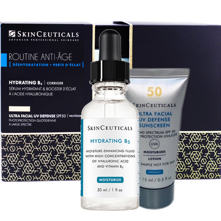 Le coffret ROUTINE ANTI-AGE Déshydratation + Eclat discount de SKINCEUTICALS, 2 soins dermo- professionnel hydratant et protecteur solaire conçu pour protéger la peau de la déshydratation pour un visage éclatant, dans votre parapharmacie en ligne à prix pas cher. Hydrating B5 (30ml) ; Ultra Facial UV Defense SPF50+ Protection Solaire (15ml) offert.