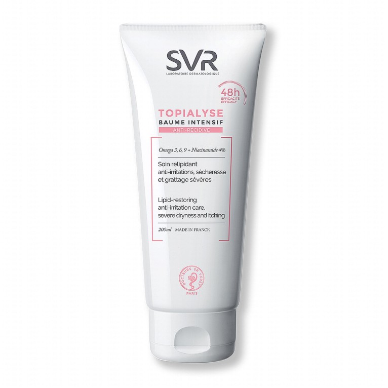 Afin de répondre aux besoins particuliers des peaux très sèches à tendance atopique sujettes aux démangeaisons et irritations, SVR a conçu une gamme de soins aux propriétés apaisantes et réparatrices : TOPIALYSE. Le Baume intensif anti-récidive Topialyse de SVR est composé d’huiles de coton et de coco riches en omégas 3, 6 et 9, de beurre de Babassu un « silicone-like » végétal, de phospholipides, de niacinamide, de sucre prébiotique et de glycérine végétale. Ces actifs vont apaiser la peau de tout inconfort et grattages dès l’application, la réparer en rééquilibrant les mécanismes qui causent l’irritation et l’incitation au grattage et la protéger des agressions extérieures en reformant le film protecteur pour lutter contre les récidives, renforcer les défenses naturelles de l’épiderme, nourrir et hydrater intensément, immédiatement et pour longtemps. Sa texture ultra-fondante non collante et non grasse pénètre rapidement à l’application pour laisser la peau douce comme du velours et délicatement parfumée. Protégée, la peau sera apaisée dès l’application et pour longtemps.