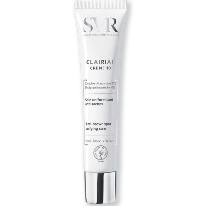 La gamme Clairial de SVR est composée de soins dépigmentants pour éliminer les taches brunes et redonner une peau uniforme. Grâce au brevet Lumiwhite+ à 10% (association d'actifs dépigmentant nouvelle génération), La crème 10 Soin anti-taches Clairial diminue et élimine les taches brunes étendues qui peuvent être causées par un masque ou mélasma, tout en luttant contre leur réapparition, produit un effet blanchissant, et hydrate intensément la peau. Sa texture non grasse et non collante au toucher velours ultra-hydratante pénètre rapidement à l’application. Jour après jour, les taches s’estompent et la peau est unifiée. Le teint lumineux.