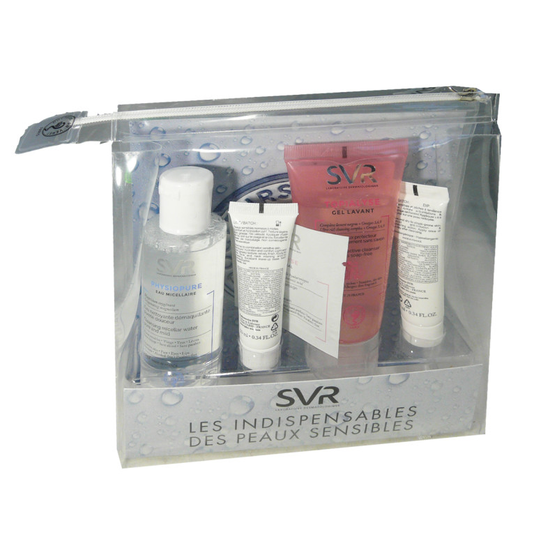 La trousse « Les indispensables » de SVR, 5 produits en petits format réunis dans une trousse pour prendre soin et apaiser les peaux sensibles au quotidien : Physiopure Eau micellaire (75ml) ; Hydraliane légère Crème Intense (10ml) ; Topialyse Gel lavant (50ml) ; Topialyse Crème émolliente (10ml) et Topialyse Palpébral Crème apaisante paupières irritées (1ml).
