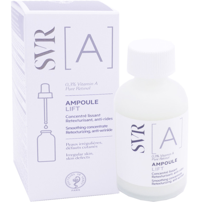[A] Ampoule Lift discount, le soin expert anti-âge concentré de SVR dans votre parapharmacie en ligne, dans un soin visage conçu pour lisser et retexturiser les peaux irrégulières avec défauts cutanées et pores dilatés, et marquées par l’âge.