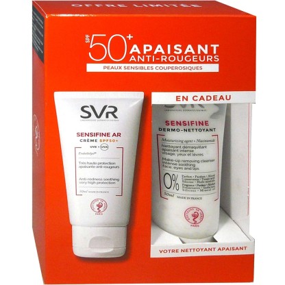 Le coffret Apaisant anti-rougeurs SENSIFINE de SVR discount, 2 soins regroupés dans votre parapharmacie discount, pour protéger du soleil et soulager les peaux réactives à tendance couperosique du visage et redonner confort et douceur : Crème SPF50+ (50ml) et Dermo-nettoyant (50ml) OFFERT.