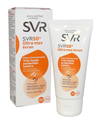 SVR 50+ Ultra-Max Ecran de SVR, le soin ultra haute protection solaire qui protège les peaux photosensibles, claires, laiteuses ou exposées à un ensoleillement extrême du visage.