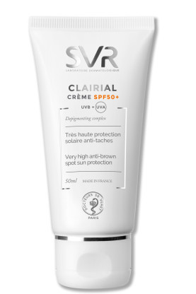 Afin d'offrir des solutions sur-mesure à tous les problèmes de taches brunes et de teint non homogène, SVR a conçu une gamme de soins correcteurs : CLAIRIAL. La crème SPF50+, à la formule haute tolérance adaptée à tous les phototypes, est spécialement conçue pour assurer une très haute protection UVA/UVB, atténuer et prévenir l’apparition des taches de pigmentation liées à l’exposition solaire. Sa formule associe la performance dépigmentante du brevet LUMIWHITE® + qui agit en inhibant la synthèse de la mélanine, à l’action hautement protectrice d’un écran minéral micronisé et de filtres photostables. Formule hypoallergénique testée sous contrôle dermatologique, sans parfum, sans paraben, non comédogène.