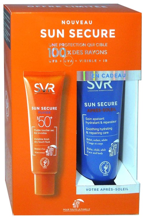 Le coffret SUN SECURE de SVR contient un Fluide toucher sec SPF50+ (50ml) pour la très haute protection solaire et un Soin apaisant après-soleil offert (50ml) pour apaiser après le bain de soleil. visage et corps de toute la famille