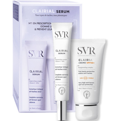 Coffret Clairial discount de SVR, 2 soins antitaches dans votre parapharmacie en ligne à prix discount, qui réduisent les taches brunes (soleil, vieillissement cutané, grossesse, imperfections, teint irrégulier) de tous les types de peau du visage, des mains et du décolleté et protègent du soleil : Sérum Anti-taches Clairial (30ml) ; Crème SPF50 Clairial (50ml)