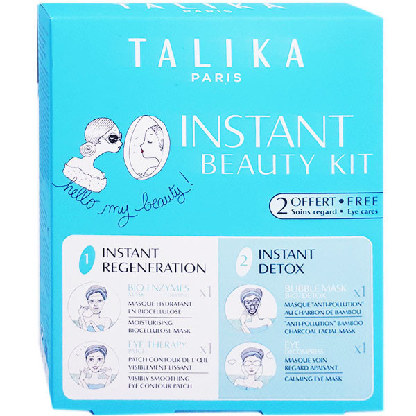 INSTANT BEAUTY KIT discount, l’innovation TALIKA dans votre parapharmacie en ligne à prix discount, dans 4 masques pour préparer la peau et lui redonner son éclat, et retrouver fraîcheur et beauté n’importe où ! Bio-Enzymes Mask (20g) ; Eye Therapy Patch (1 paire) ; Bublle Mask Bio-Detox (25g) ; Eye Decompress (3ml). Visage, et yeux