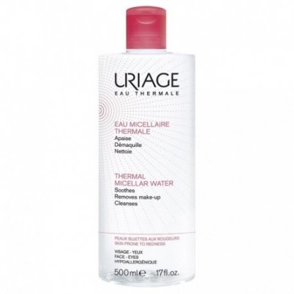 Eau micellaire thermale d'URIAGE, le soin douceur aux extraits de d’abricot et à l’eau thermale d'URIAGE pour nettoyer, démaquiller et apaiser les peaux sujettes aux rougeurs même les plus sensibles. Visage et yeux.