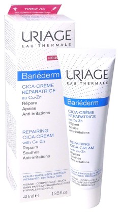 BARIÉDERM Cica-Crème d’URIAGE est le soin idéal de toute la famille pour isoler, protéger, réparer la peau, apaiser les irritations, rétablir le confort des peaux abîmées. Sa composition associe un pansement isolant et protecteur, le Poly-2P breveté, à de la smectite absorbante et neutralisante, une combinaison cuivre/zinc/eau thermale d’Uriage assainissante et anti-irritation et un complexe GF-Repair capable de stimuler la réparation de l’épiderme. Résultats : -95% de sensation d’inconfort, 87% d’apaisement immédiat.