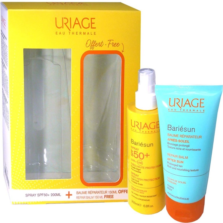 Le coffret BARIESUN d’URIAGE contient un spray SPF50+ (200ml) et un Baume réparateur après-soleil offert (150ml) pour la protection solaire et l’apaisement des peaux très sensibles du visage et du corps