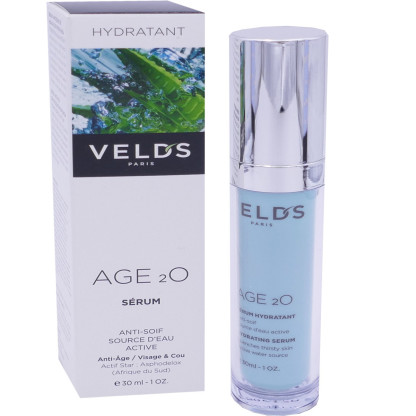 Le laboratoire VELD’S est spécialisé dans des produits aux vertus anti-âge afin d’améliorer la qualité de la peau et préservé sa jeunesse. A base d’ingrédients naturels et sauvages issus de la richesse botanique d’Afrique du Sud, les produits sont fabriqués en France et leurs effets sont semblables aux techniques de la médecine esthétique pour des résultats surprenants et hautement efficaces. La gamme AGE 2O rassemble des produits ultra-hydratants pour lutter contre le dessèchement de la peau qui est la cause de l’apparition des signes de l’âge en réinitialisant l’ensemble des séquences hydriques de l’épiderme. Le Sérum AGE 2O à base de l’Asphodelox (plante sud-africaine), de betaine (extrait de betterave bio) et de fucogel (polysaccharide Biocert), hydrate intensément et en profondeur l’épiderme pour une hydratation en continu des cellules en recréant les réservoirs naturels d’eau de l’épiderme, stimule le renouvellement des cellules cutanées et la production de collagène, gaine et lisse l’épiderme pour une peau douce sans rides de déshydratation, et redonne souplesse et confort. Sa texture fluide et opalescente sera un moment agréable pour ce soin douceur. Dès la 1ère application et pour longtemps, la peau ne tiraille plus, elle est douce et lisse, les rides sont lissées et la peau rayonne de lumière. Sans paraben