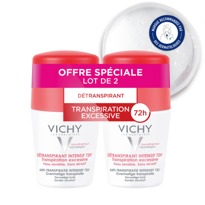 Le traitement anti-transpirant intensif 72 h, L’expertise VICHY pour réguler la transpiration excessive pendant 72 heures, peaux sensibles.