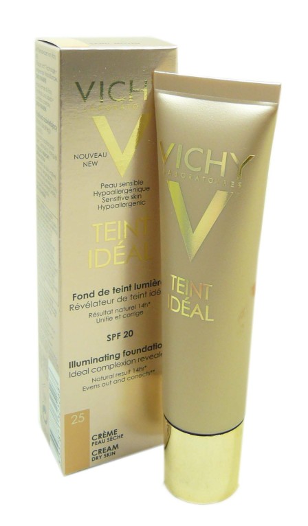 Vichy a conçu une nouvelle gamme de soins pour le teint, gorgés d’actifs aux pouvoirs perfecteurs et illuminateurs pour offrir naturellement une peau radieuse et un teint rayonnant : TEINT IDEAL. Les fonds de teint crème à la texture onctueuse adaptée aux peaux sèches sont spécialement formulés pour corriger les imperfections et unifier le teint de façon très naturelle pendant 14 heures. Ils associent un complexe correcteur perfecteur de peau à des vitamines C et E aux propriétés antioxydantes et un agent vitalisant. La nouvelle technologie lumière de ces fonds de teint recouvre chaque millimètre de l’épiderme d’un véritable voile de lumière pour sublimer la peau et illuminer le teint. Formule hypoallergénique enrichie à l’eau thermale de Vichy, sans paraben.