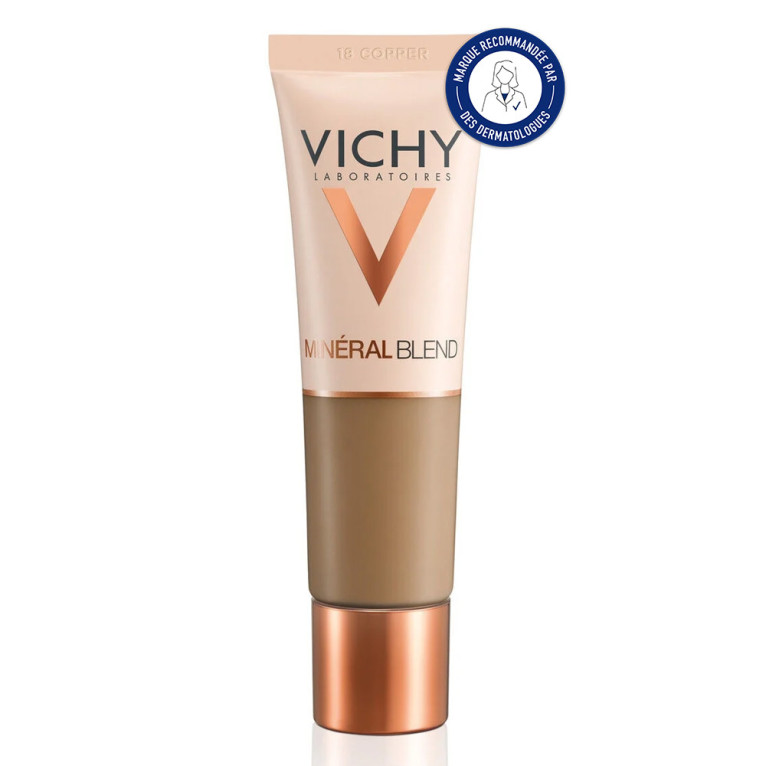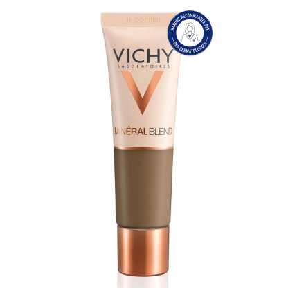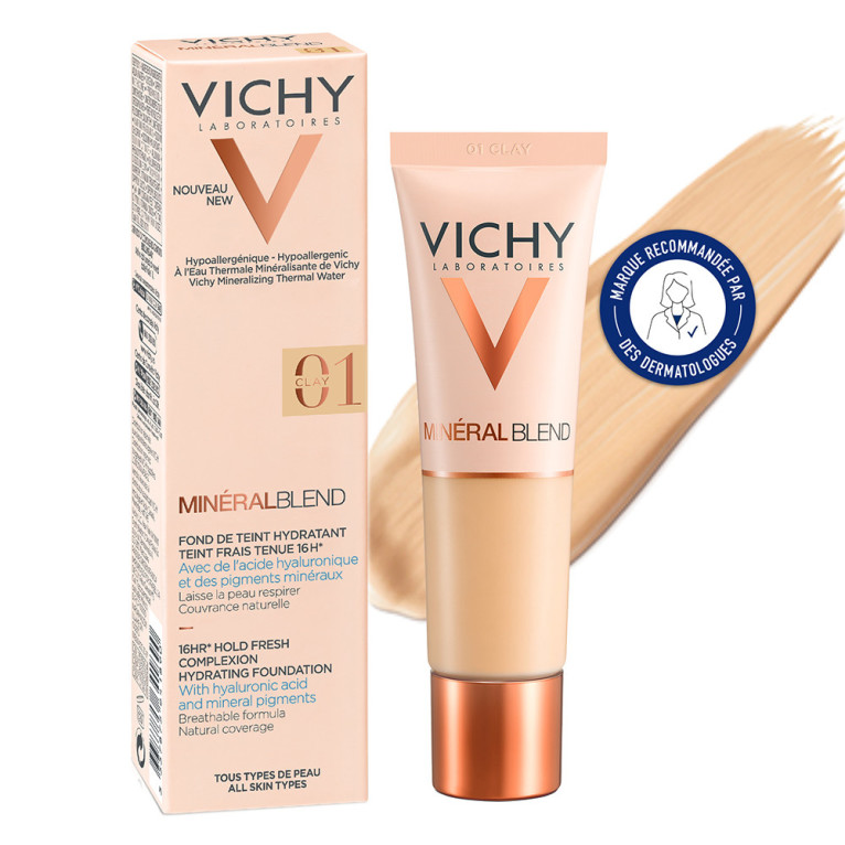 Vichy a conçu une nouvelle gamme de soins minéraux pour le teint au pouvoir hautement correctif et assurant une tolérance optimale : MINERALBLEND. Les fonds de teint hydratants sont spécialement formulés pour hydrater la peau et procurer un teint frais pendant 16 heures. Ils associent une haute concentration en pigments minéraux assurant une correction optimale pendant 16 heures, à de l’acide hyaluronique d’origine naturelle pour hydrater intensément la peau et la repulper. Le fond de teint riche en Eau thermale de Vichy reminéralisante renforce la barrière de la peau et la régénère. Sa texture légère fond sur la peau sans laisser d’effet masque pour une peau qui respire tout au long de la journée. Instantanément et pendant 16 heures le teint est unifié et lumineux, la peau retrouve souplesse et confort. Jour après jour, la peau est lumineuse et les signes de fatigue s’estompent. Formule haute tolérance testée sous contrôle dermatologique, hypoallergénique, non comédogène