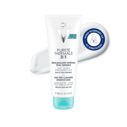 Pureté Thermale démaquillant intégral 3 en 1, l’expertise VICHY dans un soin complet qui nettoie en douceur et démaquille le visage et les yeux des peaux sensibles.