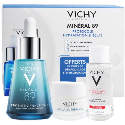 Le coffret Minéral 89 Protocole Hydratant et Éclat des Laboratoires VICHY à prix discount, 3 soins ciblés pour un programme hydratation en vente en ligne dans votre parapharmacie discount : L’eau Micellaire minérale Pureté Thermale spécial peaux sensibles (100 ml), le sérum concentré Probiotic Fractions quotidien Minéral 89 (30 ml) et la crème de jour Aqualia Thermal hydratante légère offerte (15 ml).