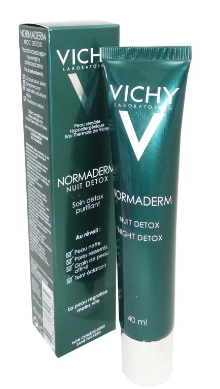 Vichy a conçu une gamme complète de soins pour transformer les peaux à imperfections et lutter contre les boutons, les rougeurs, la brillance et le teint terne. NORMADERM Nuit détox, à la texture légère et fraîche qui pénètre la peau sans effet de gras, est un soin spécialement conçu pour réduire pendant la nuit la production de toxines et de sébum, causes de la mauvaise qualité de la peau. Sa composition révolutionnaire à base d’actifs détoxifiants : Eperuline 0,5% + LHA 0,3% + Acide Salicylique 0,5%, et purifiants Perlite à 0,25% + poudres absorbante, offre dès le réveil une peau nette et un teint éclatant. Adapté aux peaux sensibles.