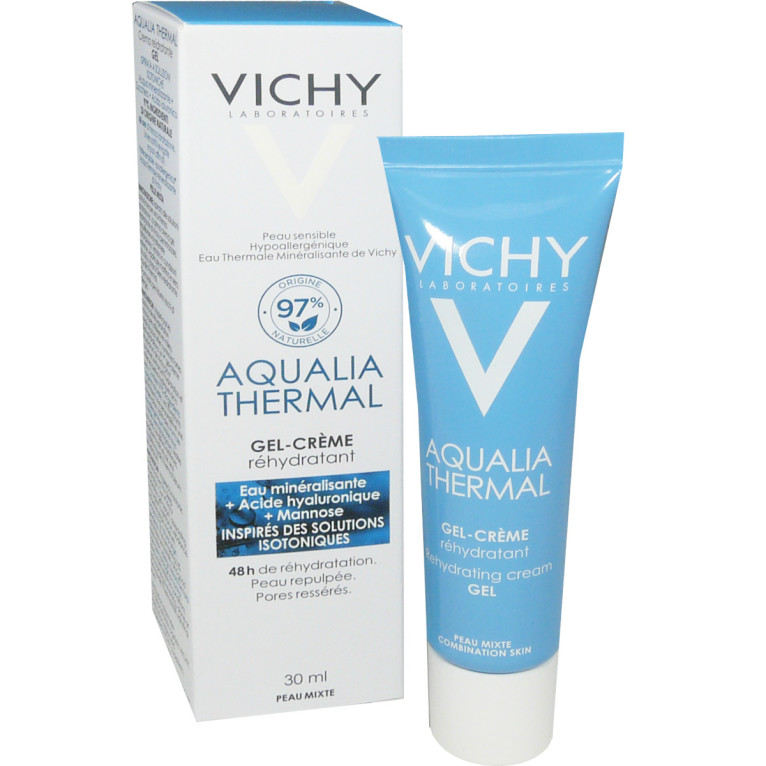 VICHY a conçu une gamme de soins enrichis en eau thermale de Vichy pour offrir aux peaux sensibles toutes les vertus apaisantes et fortifiantes de cette eau de beauté : AQUALIA THERMAL. Le Gel-crème Réhydratant à la texture fraîche comme un gel et douce comme une crème est spécialement formulé pour stimuler la circulation d’eau dans toutes les zones du visage et hydrater intensément la peau pendant 48 heures. Sa composition, inspirée des solutés de réhydratation isotoniques, associe à l’eau minéralisant de Vichy de l’acide hyaluronique, du mannose végétal, du beurre de karité et de la glycérine capables de transporter l’eau nécessaire à l’hydratation de la peau, protéger les cellules cutanées de la pollution, resserrer les pores et adoucir la peau. Résultat : le teint s’éclaire, la peau est repulpée et retrouve sa fraîcheur. Formule hypoallergénique, testée sur peaux sensibles sous contrôle dermatologique