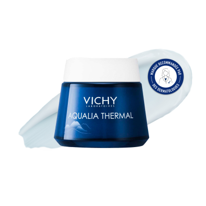 VICHY a conçu une gamme de soins enrichis en eau thermale de Vichy pour offrir aux peaux sensibles toutes les vertus apaisantes et fortifiantes de cette eau de beauté : AQUALIA THERMAL. Le soin de nuit, à la texture gel-crème légère et onctueuse, est spécialement formulé pour stimuler la circulation d’eau dans toutes les zones du visage et hydrater intensément la peau pendant la phase de régénération nocturne. Dès le réveil, la peau est ressourcée, les traits sont reposés, le visage est défatigué. Formule hypoallergénique testée sous contrôle dermatologique, sans paraben.