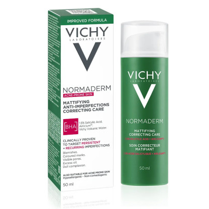 La gamme Normaderm de VICHY est composée de soins anti-imperfections (nettoyage, maquillage, soins). Ce soin resserre les pores de l’épiderme pour réguler la quantité de sébum et diminuer les imperfections, affine le grain de peau, matifie pour lutter contre les brillances, hydrate intensément pendant 24 heures et apaise de tout inconfort, grâce au complexe anti-imperfection à base de LHA, et d’acide salicylique, à la nouvelle technologie à base d’Air Licium, Phe Resorcinol, ainsi qu’à sa richesse en eau thermale de vichy. Sa texture fraîche et non grasse laisse la peau douce pour une application agréable. Jour après jour, la peau est nette et sublimée, le teint éclatant.